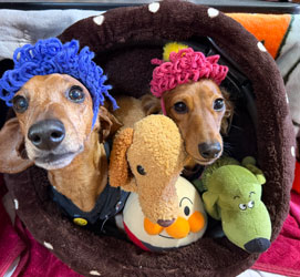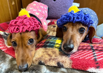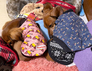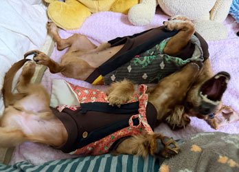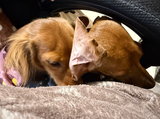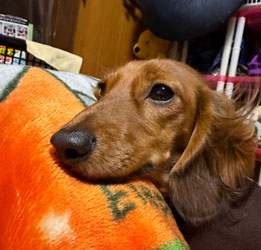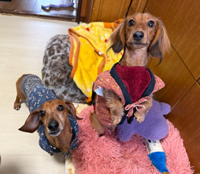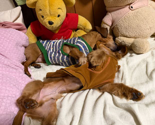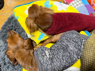 だいちゃんは「あったかい前」、オイラは「毛布の中」でおつかれやすみでやんす。